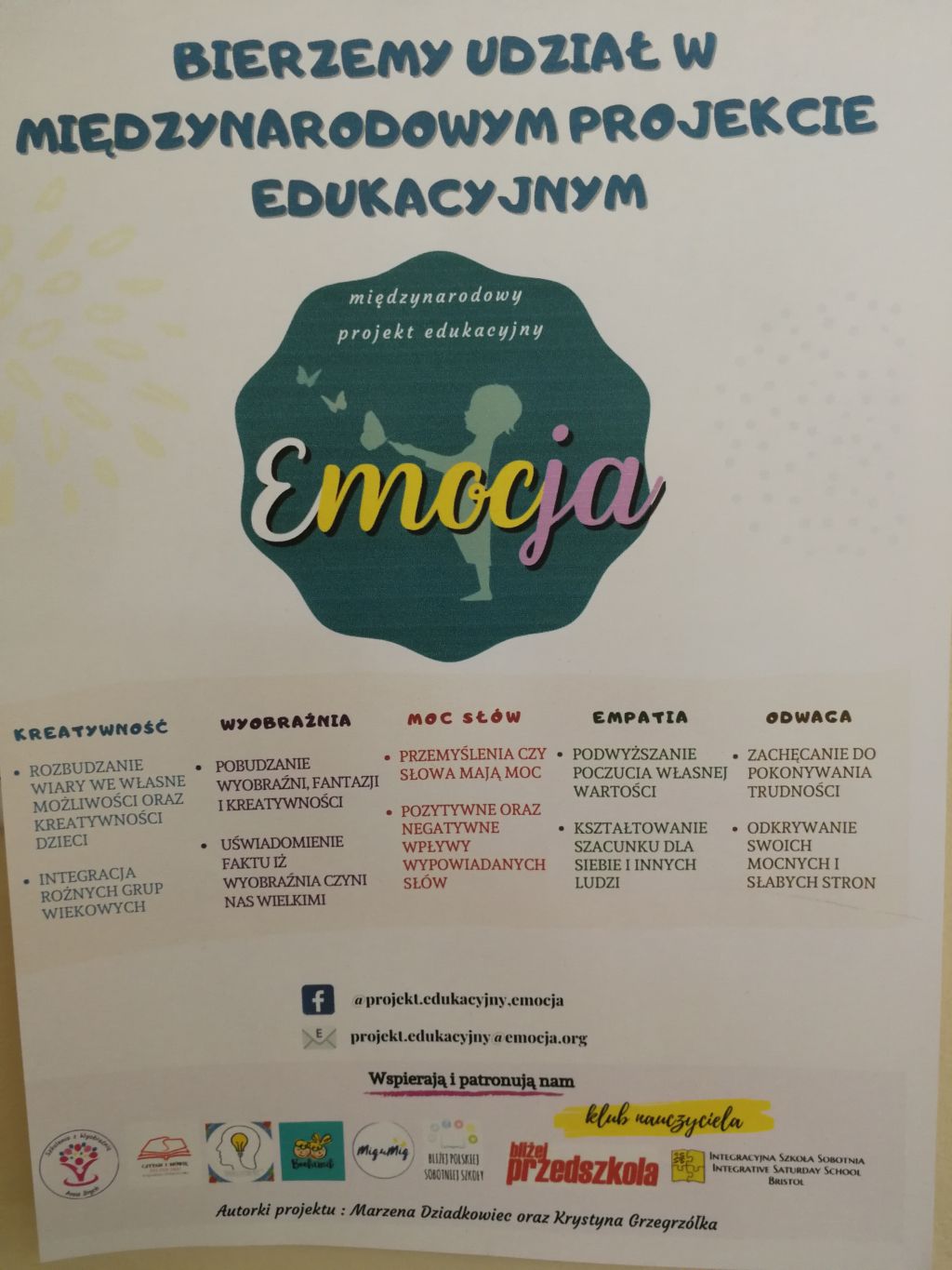 Uczniowie edukacji wczesnoszkolnej biorą udział w Międzynarodowym Projekcie Edukacyjnym pt. „Emocja”. Głównym założeniem działań w projekcie jest pokazanie dzieciom, że ludzie różnią się od siebie nie tylko wyglądem, zachowaniem, kolorem skóry, wyznaniem i że nie wszystkie różnice widać gołym okiem. Dążymy do tego, aby eliminować zachowania agresywne w stosunku do innych, wzbudzać w  dzieciach postawę empatii i akceptacji. W ramach projektu będziemy podejmować się wielu działań artystycznych, tworzyć różnego rodzaju instalacje, pracować w grupie.